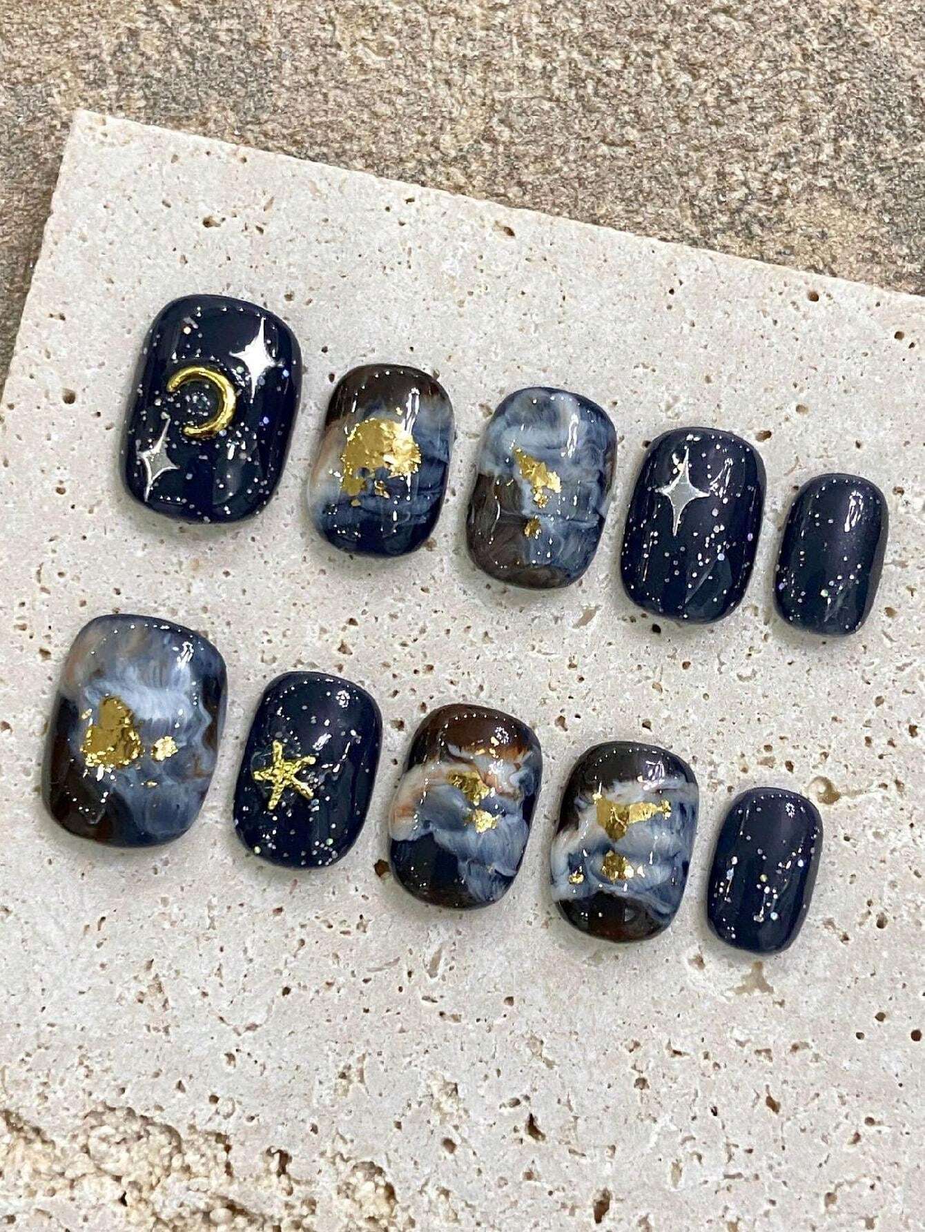 Celebrity nail artist Elle Gerstein says, “This look needs a chrome detail”. Gold accents make perfect starry nights against matte black. Silver details work beautifully with deep navy. Black and silver create dramatic contrasts that make celestial elements stand out.