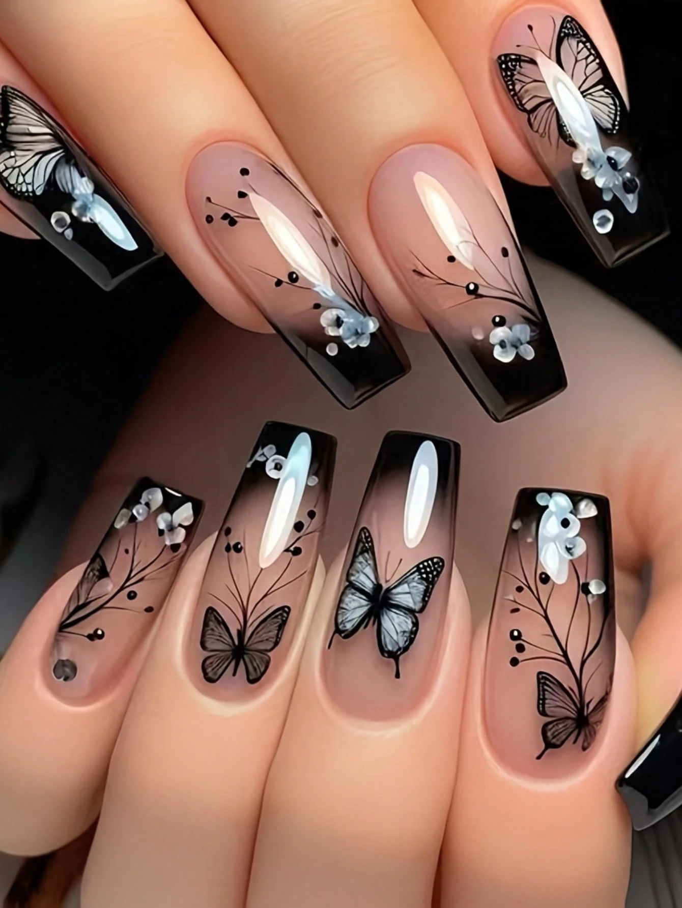 Black butterfly nail stickers create a dramatic contrast against any base color. Quality nail art stickers showcase beautiful black and white butterflies that make your manicure stand out. These thin adhesive materials with fine prints stick on easily to create stunning butterfly nail art.
